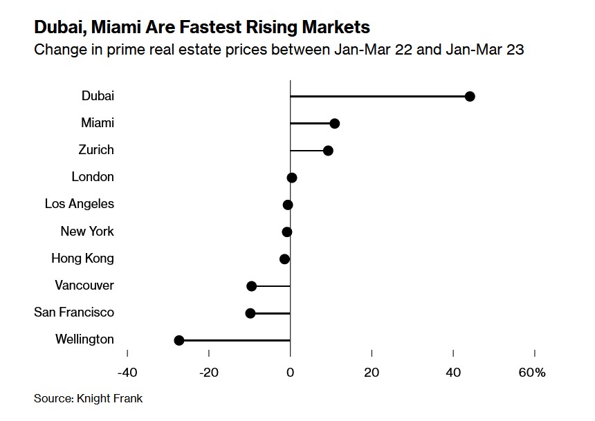 Αξίζει, ωστόσο, να σημειωθεί ότι η πλειονότητα των πόλεων που παρακολουθούνται από την εταιρεία σημείωσαν αύξηση των τιμών το πρώτο τρίμηνο, με το Ντουμπάι και το Μαϊάμι να σημειώνουν διψήφιο ποσοστό αύξησης. Συγκεκριμένα, οι τιμές στο Ντουμπάι αυξήθηκαν κατά 44%, ανεβάζοντας τη συνολική ανάπτυξη της εποχής της πανδημίας από τον Μάρτιο του 2020 στο 149%.