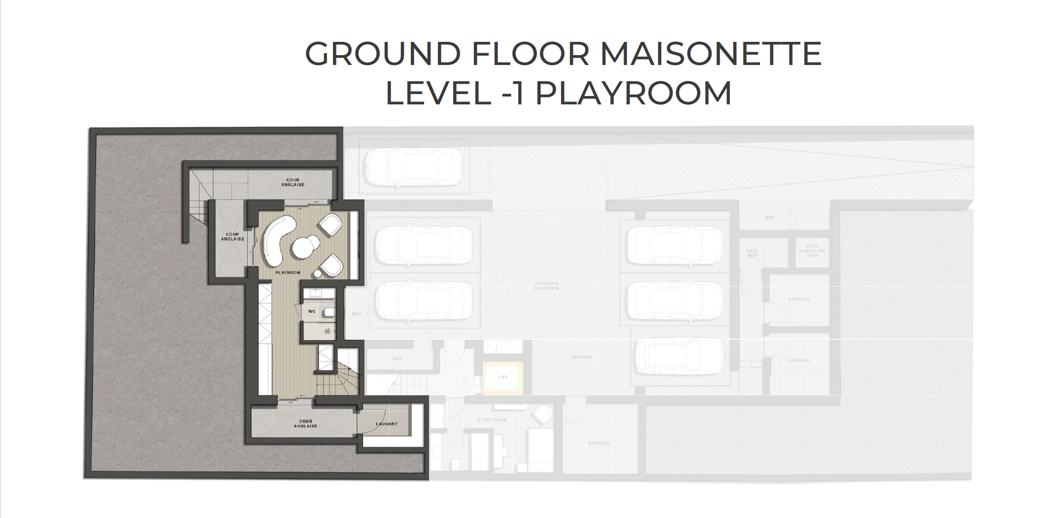 • Επίπεδο -1 (44 τ.μ.) – Tο επίπεδο αυτό διαθέτει φυσικό φως χάρη μέσω του cour anglaise. Φιλοξενεί έναν άνετο χώρο playroom/πολυχώρο, μπάνιο και ξεχωριστό χώρο πλυντηρίου, προσφέροντας ευελιξία που προσαρμόζεται στις σύγχρονες ανάγκες μιας οικογένειας.