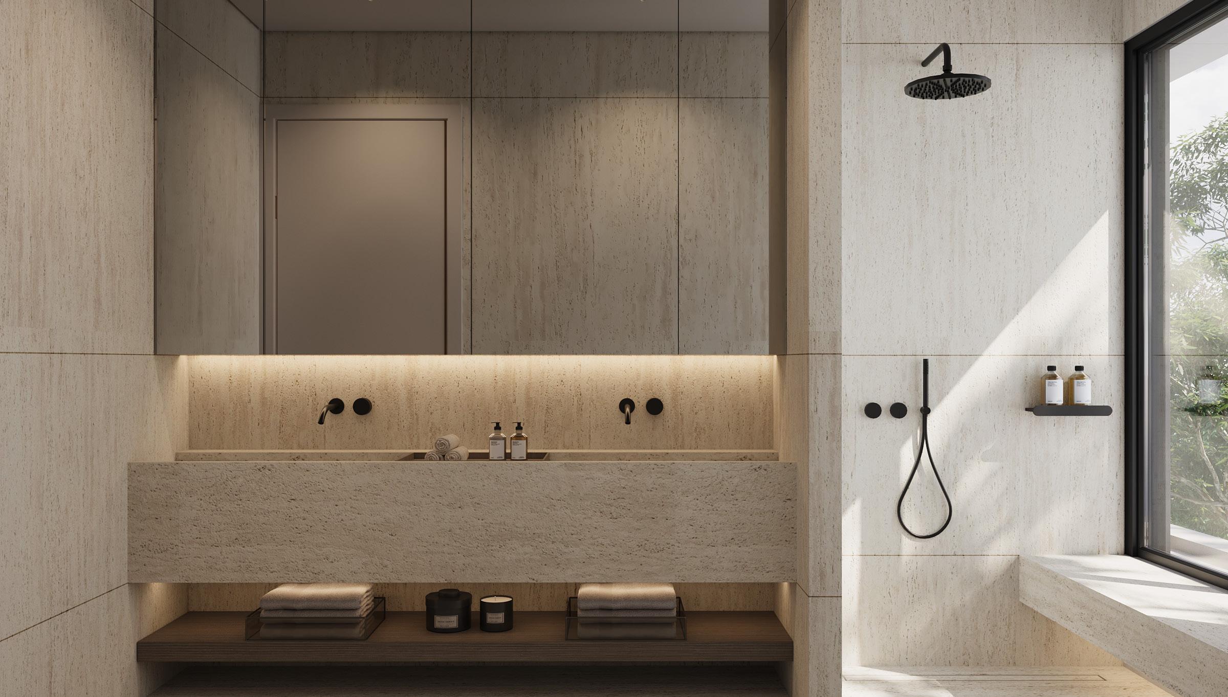 • Εσωτερικοί χώροι – 3 υπνοδωμάτια, 3 μπάνια + 1 WC επισκεπτών, σαλόνι διπλού ύψους με άπλετο φυσικό φως, δωμάτιο πλυντηρίου και αποθήκη.