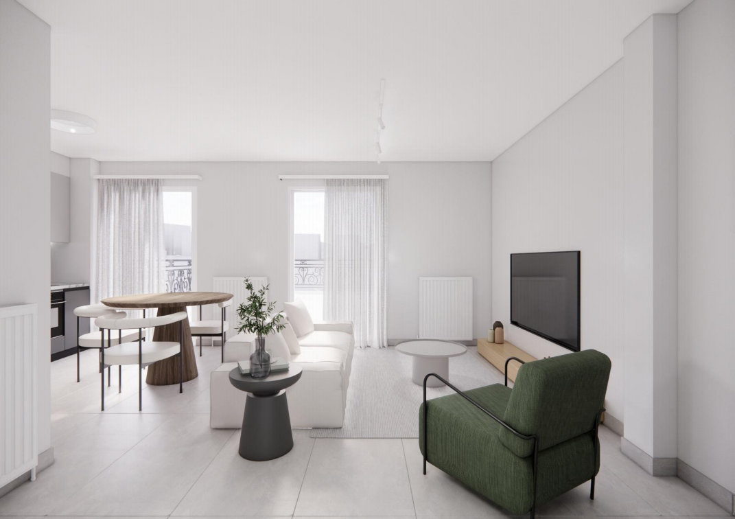 - Open-plan διαρρύθμιση καθιστικού-κουζίνας.